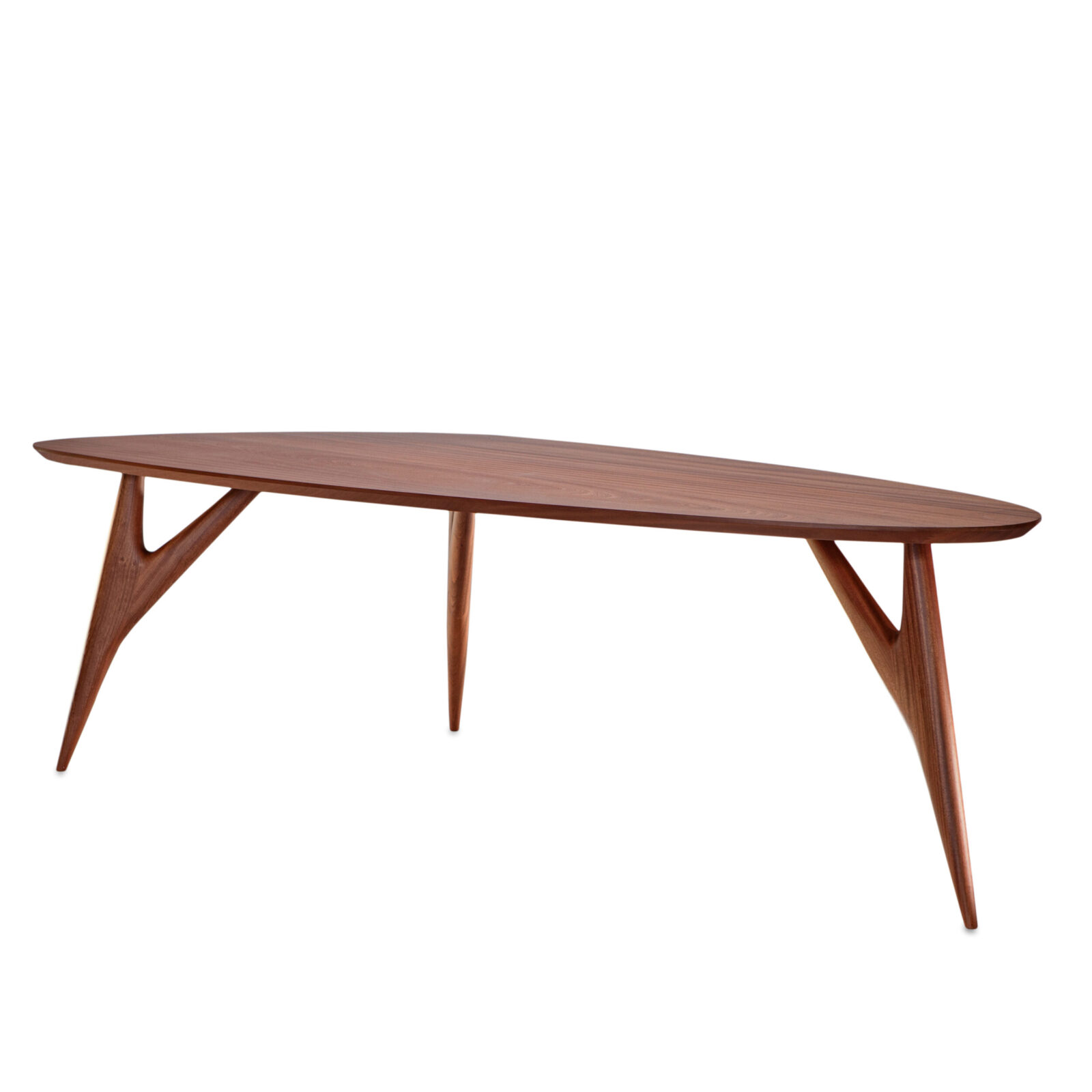 Realizzato interamente a mano, questo tavolo unisce estetica scultorea e funzionalità quotidiana. Inoltre, le gambe affusolate e il piano dalle forme organiche creano un equilibrio perfetto tra solidità e leggerezza visiva. Allo stesso tempo, la finitura calda del mogano dona profondità e accoglienza all’ambiente, rendendolo ideale per sale da pranzo importanti o spazi contract di alto livello.